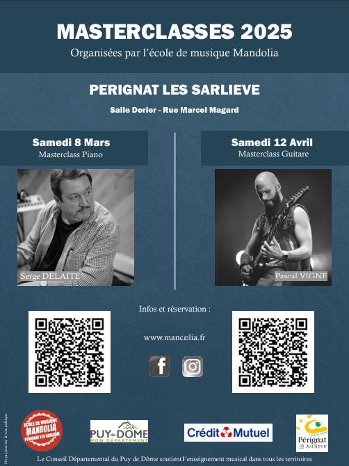 L’association Mandolia propose des cours de musique sur Pérignat lès Sarliève (63170) pour les enfants comme les adultes. Ces cours ouverts à tous par une méthode d'apprentissage moderne, ludique et adaptée à chacun, favorisent le plaisir et la qualité de l’expression artistique. Vous évoluez à votre rythme, en fonction de vos goûts et de vos envies (tous les styles sont abordés: pop, rock, world, variété, classique, jazz, groove, RnB/Soul…). Cours individuels, Formation artistique, Eveil instrumental, Eveil musical, Formation de Musique Actuelle (Assistée par Ordinateur). L'école de musique MANDOLIA reçoit le soutien du Conseil Départemental du PUY DE DÔME et de la |